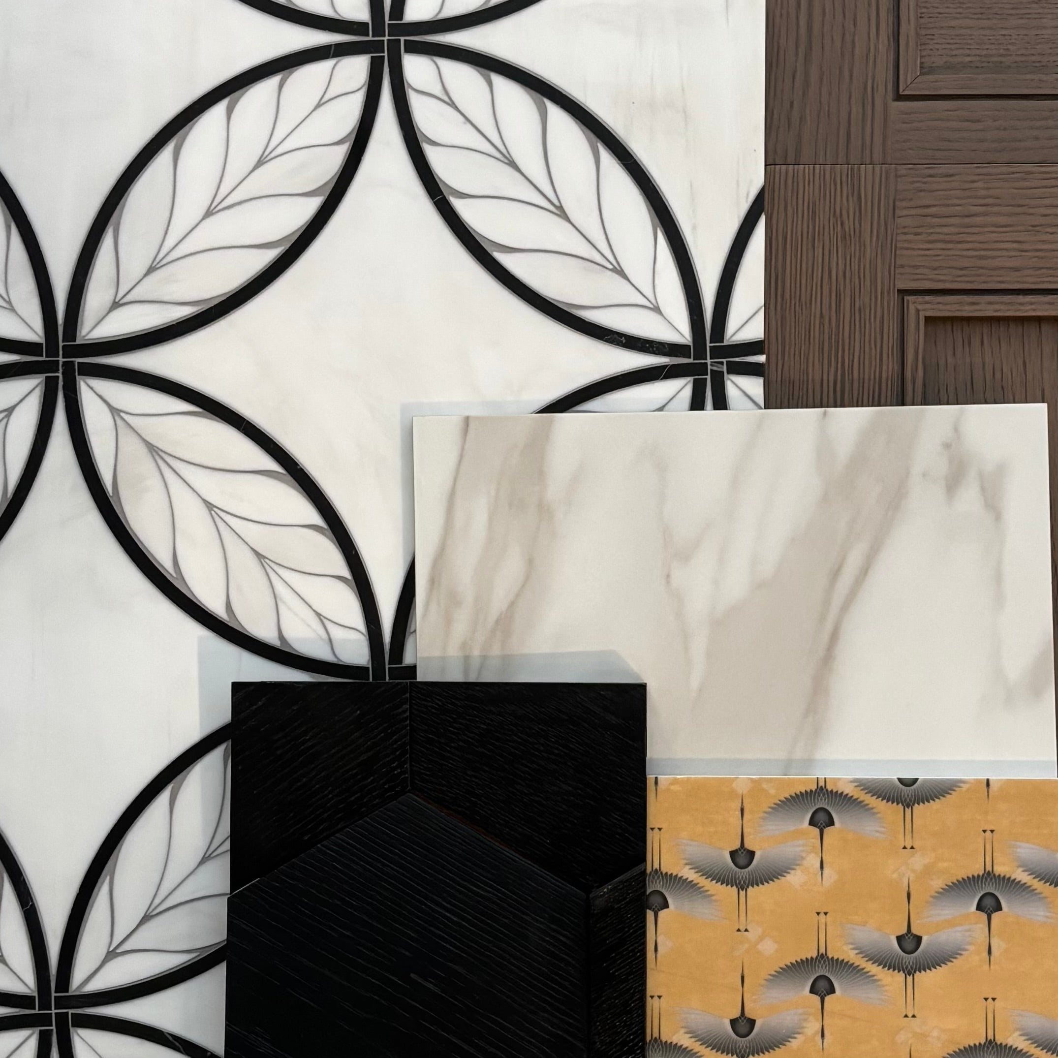 A captivating balance of light and dark, Ethereal Grandeur is a moodboard that blends classical marble veining, intricate mosaics, and bold geometric wood elements to create a space of striking refinement. This curated selection evokes an air of timeless sophistication while embracing contemporary depth, making it ideal for interiors that demand both opulence and warmth. Whether for a grand entryway, an exquisite powder room, or an upscale hospitality space, this composition brings luxury, texture, and artistry into perfect harmony.